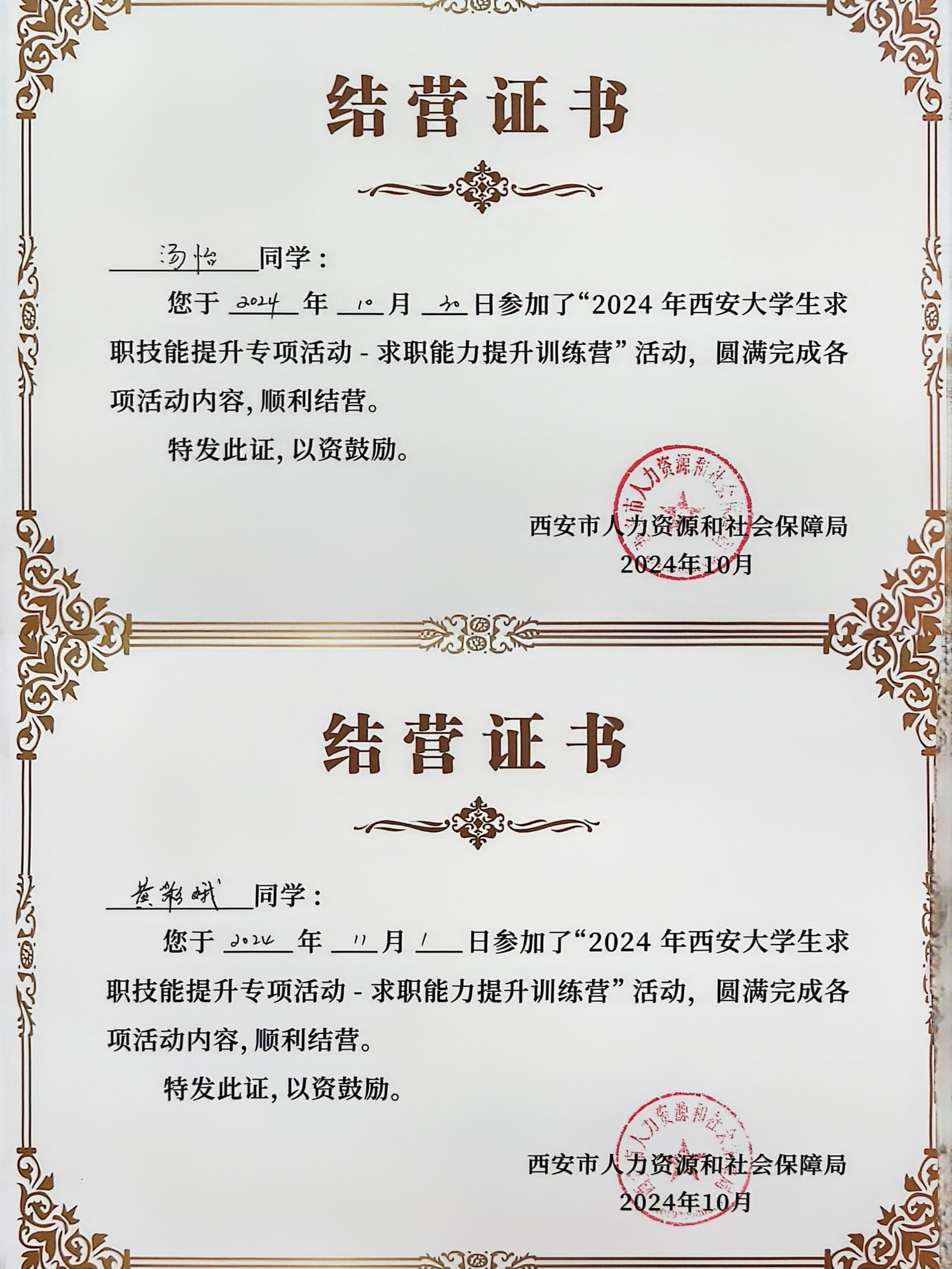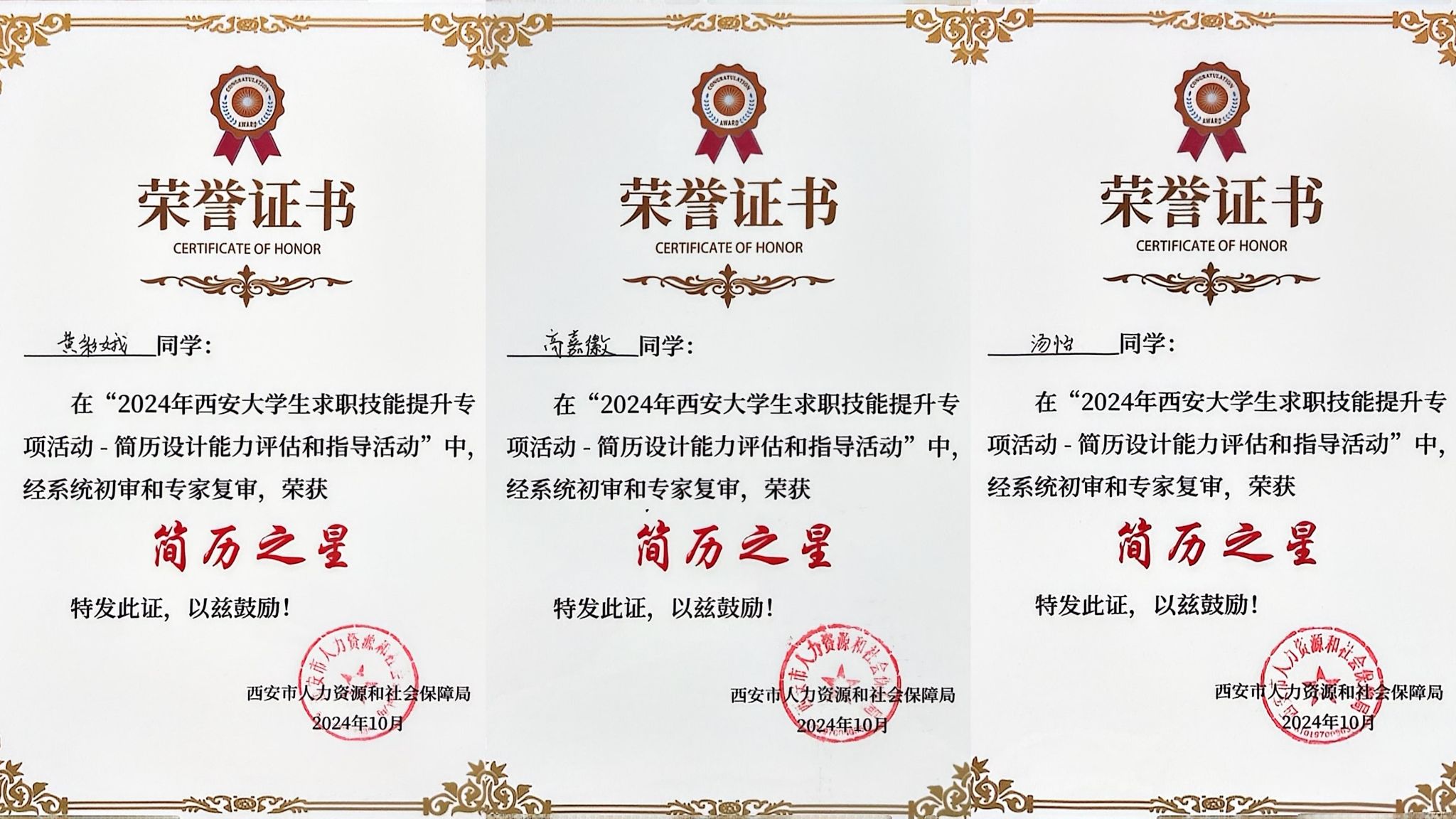 近日,2024年西安大学生求职技能提升专项活动圆满落幕,我校学子凭借出色的综合素质和求职实践能力,在本次活动中表现优异。黄彩娥等5名学子获“简历之星”称号,汤怡等2名学子获“求职能力提升训练营”结营证书。此外,学校被西安市人力资源和社会保障局评为“2024年西安大学生求职技能提升专项活动最佳组织奖”。