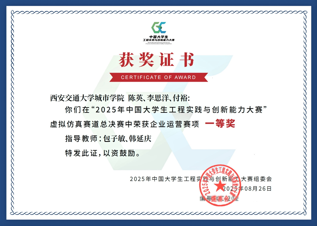 近日,中国大学生工程实践与创新能力大赛公布了获奖名单。在大连工业大学举行的企业运营仿真赛项全国总决赛中,来自经济与管理学院的陈英、李思洋、付裕代表队获全国总决赛一等奖。